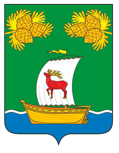 Описание герба звучит так: «В зелёном поле поверх лазоревой волнистой оконечности, тонко окаймлённой серебром, расположено золотое судно (карбас) с рулём и раздуваемыми слева вымпелом и серебряным парусом. Парус обременён червлёным оленем с золотыми рогами, глазами и копытами. Всё это сопровождается сверху вырастающими из-за краёв двумя - по одной из-за каждого края, сообращёнными золотыми кедровыми ветвями, каждая о трёх шишках».